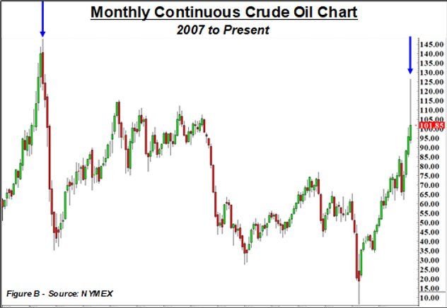 Another hot commodity is crude oil. NYMEX Light Crude Oil futures skyrocketed to the highest level since 2008 (fig. B). The EU relies on Russia for 40% of its gas consumption, which is used for heating homes and powering businesses. Unlike the US, which can replace absent Russian gas with supply from our closest neighbors, Mexico and Canada, Europe doesn’t have a Plan B.